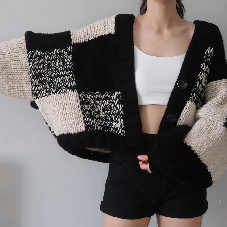 คาร์ดิแกนคอวี ทรงครอป ลายตารางหมากรุก (Checkered) สีขาวและดำ มีขนเฟอร์นุ่ม (Fuzzy Trim) ที่ขอบเสื้อ