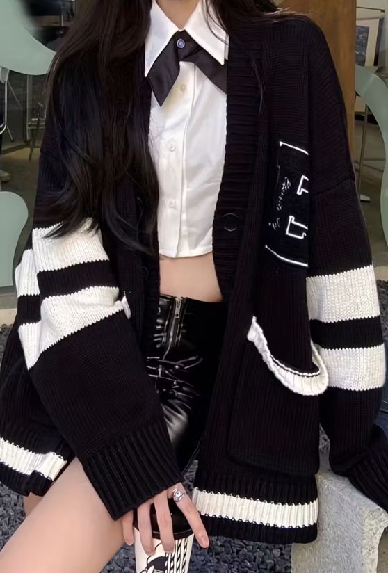 คาร์ดิแกนซิปหน้า สีดำ มีลายทาง (Stripe) สีขาวขนาดใหญ่บริเวณคอและข้อมือ ทรงครอป/เข้ารูป วัสดุ Knit
