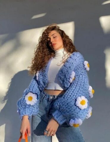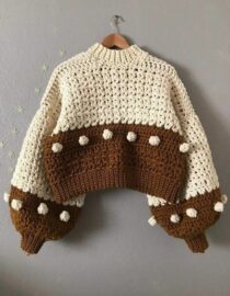 คาร์ดิแกนซิปหน้าสีขาวครีม มีลายปัก/ปะรูปสตรอว์เบอร์รีเล็กๆ กระจาย วัสดุ Soft Knit ทรงหลวม สไตล์น่ารัก
